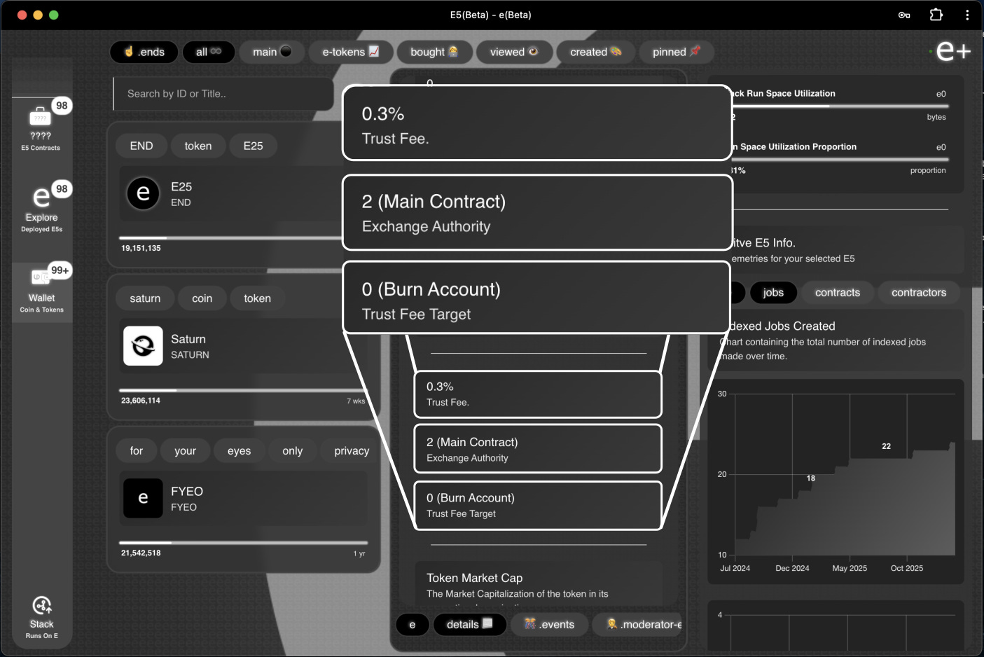 A trust fee is basically a cut on all value used to create trust in a contract using a given token, with the token’s exchange authority being the account responsible for setting the proportion itself. When you create a token on E5, you are the tokens authority unless specified otherwise in the settings. Contracts can also act as authorities that control the configuration of a given token’s exchange through consensus, with special permissions such as to change the trust fee, freeze balances and reconfigure the token’s basic access features.